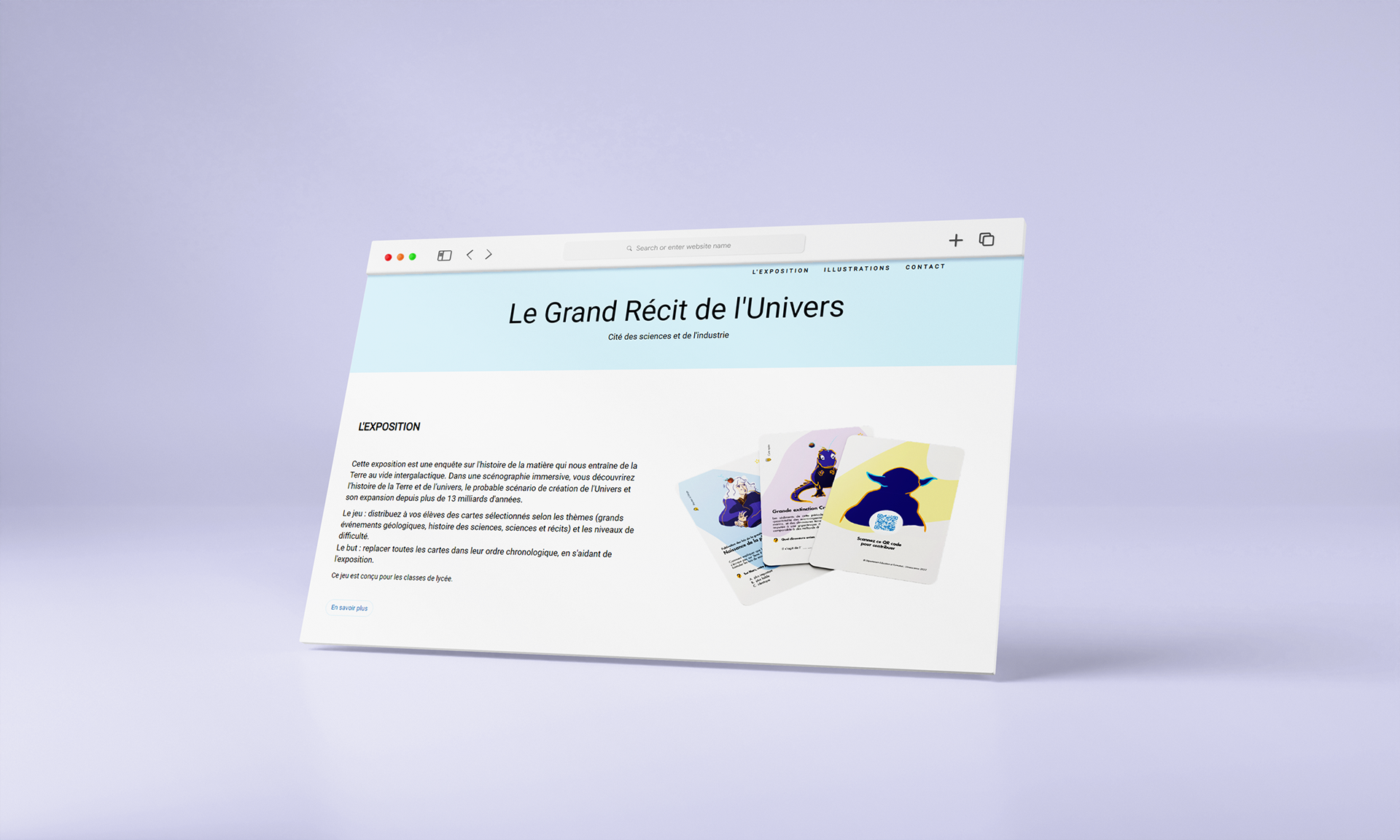 Page web responsive réalisée dans le cadre d'un projet réalisé avec la Cité des sciences et de l'industrie : un jeu de cartes illustré pour rendre ludique la visite de l'exposition "Le Grand Récit de l'Univers".